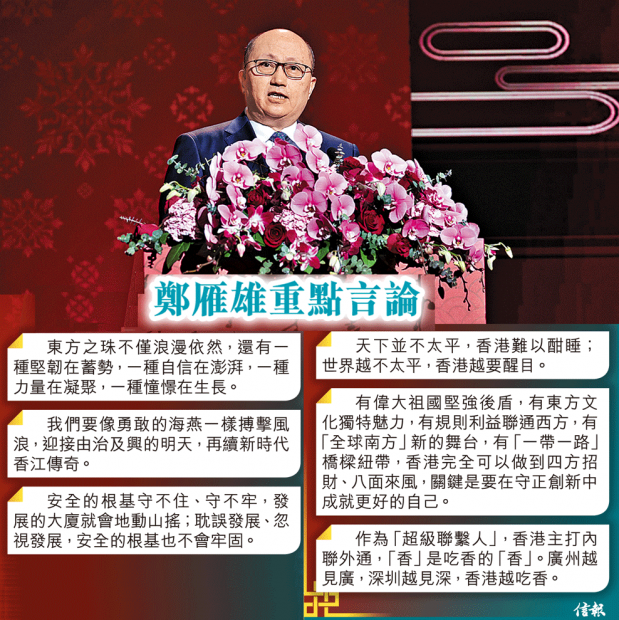 鄭雁雄致詞時指去年本港落實《基本法》23條立法令人深感欣慰,形容立法取得「全民支持、全程順利、全票通過」結果,補上欠缺多年的「安全短版」。他在回顧中提及機場三跑啟用、奧運奪金及港產大熊貓出生等,認為本港「東方之珠不僅浪漫依然,還有一種堅韌在蓄勢,一種自信在澎湃,一種力量在凝聚,一種憧憬在生長。」