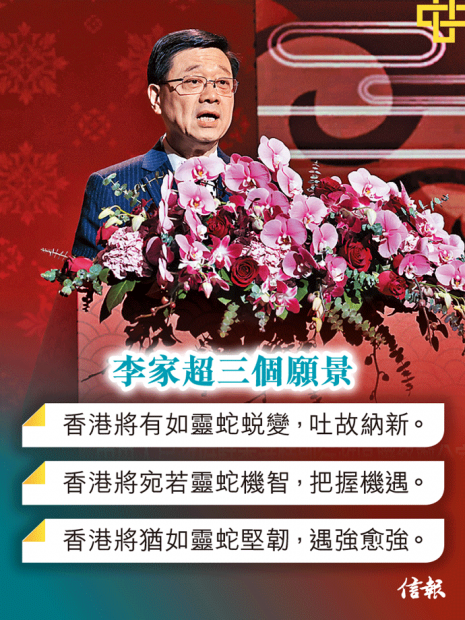 李家超補充,香港將「宛若靈蛇機智,把握機遇」,特區政府會團結帶領社會各界銳意改革,對接國家戰略,塑造經濟發展新動能新優勢,另會「如靈蛇堅韌,遇強愈強」,在百年大變局中繼續推動香港由治及興。他特別提及工商界、科技界、文藝界及教育界,各界要善用「一國兩制」,把握機遇、說好香港故事等。他同時承諾特區政府會更主動變革,以更開創性的思維、更果敢的行動迎接挑戰,抓住機遇,推動香港社會各領域的轉型升級向世界展現「一國兩制」的蓬勃生機。