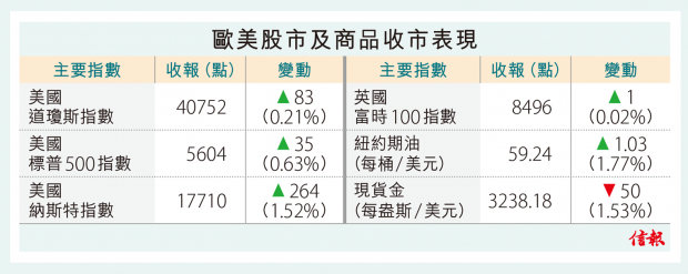 至美市收市,道指報40752點,升83點,標指升0.63%,納指上揚1.52%。歐股德國及法國休市,英股微升0.02%。