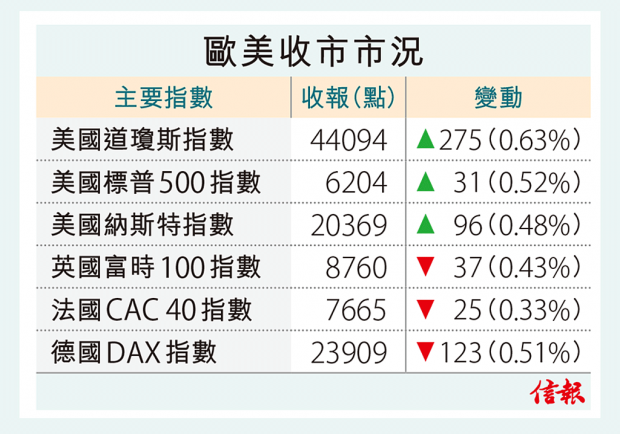 至美市收市,道指報44094點,升275點,標指漲0.52%,納指揚0.48%。歐股偏軟,英、法及德股分別跌0.43%、0.33%及0.51%。