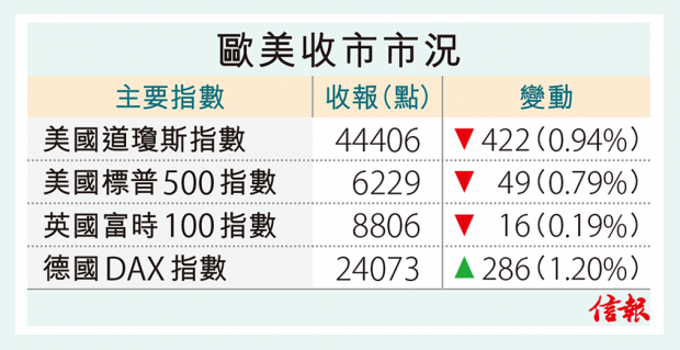 美市收市,道指下滑422點,報44406點,標指挫0.79%,納指跌0.92%。歐股個別發展,法股及德股收高0.35%及1.2%,英股挫0.19%。