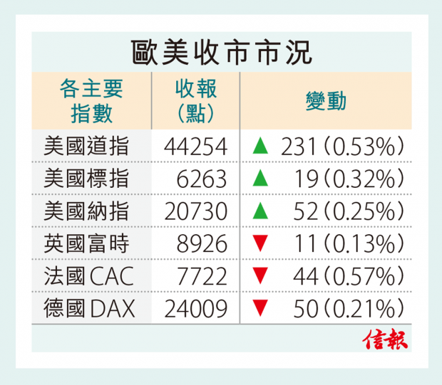 美市收市,道指仍升231點,報44254點;標指反彈0.32%;納指轉漲0.25%。歐洲股市反覆收低,英國、法國和德國股市分別挫0.13%、0.57%及0.21%。