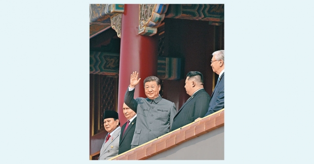 習近平離開城樓檢閱部隊期間,分別坐在他右邊和左邊的普京與金正恩,一度隔空互相致意。習近平回到城樓後,先後和普京及金正恩攀談,又在裝備方隊登場期間不斷指着各種軍備,似是向普京和金正恩介紹,兩人亦疑向習近平詢問有關情況。
