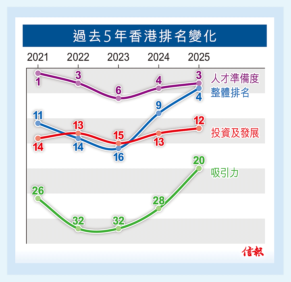 香港今年表現轉好,所有三大人才競爭力因素均連續第二年上升。其中「吸引力」排名攀升8位,至第20名,顯示從低位反彈;「人才準備度」及「投資及發展」的排名均上升一位,分別位列第三及第12。