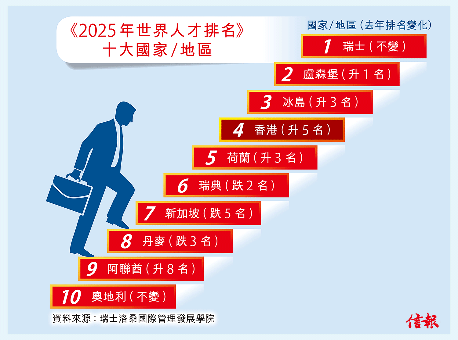 瑞士洛桑國際管理發展學院發布《2025年世界人才排名》,在全世界69個經濟體中,香港由去年的第九位躍升至第四位,是歷來最高排名,亦為亞洲之冠。瑞士第十年蟬聯榜首,第二及第三名依次為盧森堡及冰島,較去年分別升一位及升三位。