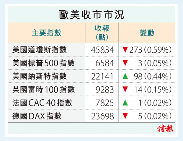 至美市收市,道指跌273點,標指轉挫0.05%,納指上揚0.44%。歐股好淡爭持,英、德股分別跌0.15%及0.02%,法股則微升0.02%。