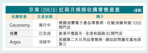京東今年以來積極在海外進行收購,早前向歐洲消費電子產品零售商MediaMarkt及Saturn的母公司Ceconomy作出自願公開收購要約,每股現金對價為4.6歐羅,對Ceconomy的估值約22億歐羅;Ceconomy在歐洲擁有超過1000間門店。