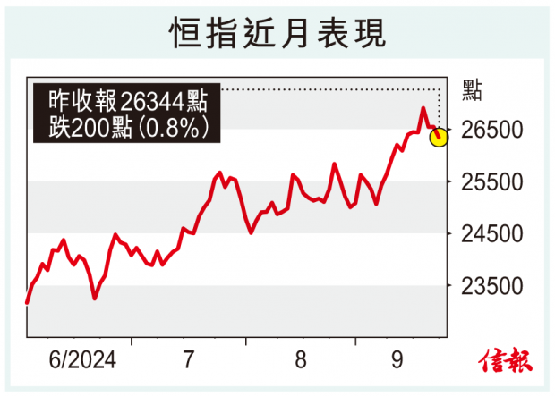 中國國家主席習近平及美國總統特朗普上周五通電話,但對中港股市昨天的刺激作用有限。恒指在超強颱風「樺加沙」襲港前表現偏軟,低開85點後,早段跌幅曾短暫收窄至65點,惟午後跌勢加劇。恒指最終失200點(0.8%),報26344點,失守10天線(26384點)。