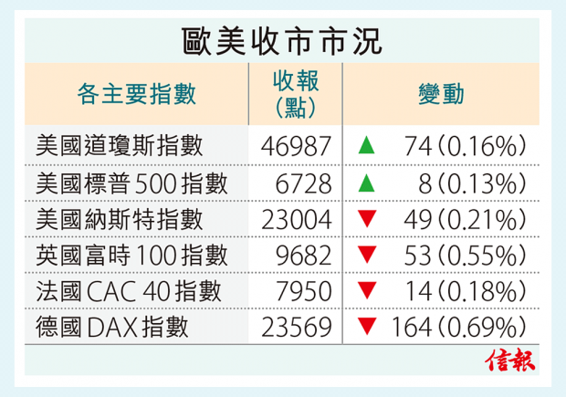 美市收市,道指報46987,轉漲74點,標指彈0.13%,納指回吐0.21%。歐股向下,英、法及德股分別挫0.55%、0.18%及0.69%。比特幣一度再失守10萬美元,最多跌1.85%至99213美元,其後曾轉升超過4%,至103833美元。