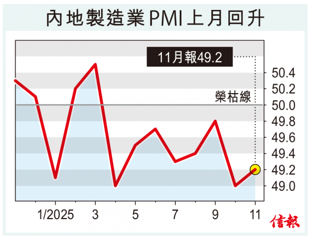 內地製造業活動連續8個月處收縮區。國家統計局公布,11月製造業採購經理指數(PMI)為49.2,較10月回升0.2個百分點,但低於市場預期的49.4;非製造業商務活動指數降至49.5,按月下降0.6個百分點,遜於市場預期的50。