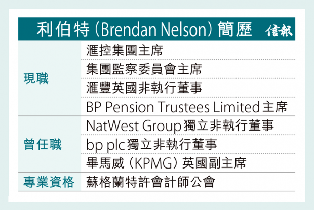 滙控(00005)歷時超過6個月的主席繼任人尋找過程終於完成。該行昨天宣布,委任利伯特(Brendan Nelson)【圖】為集團主席,並且於即日起生效。