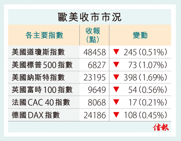 至美市收市,道指報48458點,轉跌245點,標指挫1.07%,納指瀉1.69%。歐股偏軟,英、德、法股分別跌0.56%、0.45%及0.21%。瑞士銀行(UBS)股價收市升2.5%,盤中升幅一度達5%,至17年新高,主要是瑞士一些具影響力的議員提出妥協方案,放寬對該行的資本要求。