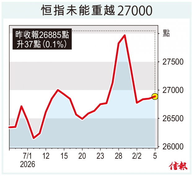 恒指昨低開219點,早段跌幅反覆擴大,最多曾插436點,低見26410點。大市臨近中午跌幅收窄,尾段最多倒升72點,最終收市漲37點(0.1%),報26885點,繼續受制於20天線(26894點)。