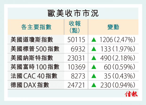 美市收市,道指飆1206點或2.47%,標指漲1.97%,納指升2.18%。歐股轉穩,英、法及德股分別升0.59%、0.43%及0.94%。