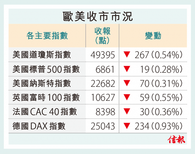 至美市收市,道指報49395點,下滑267點,標指跌0.28%,納指挫0.31%。歐股全線向下,英、法及德股分別下挫0.55%、0.36%及0.93%。