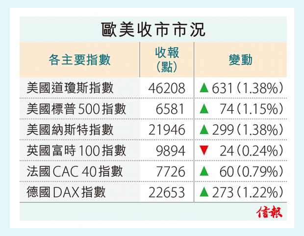 美市收市,道指飆631點,標指漲1.15%,納指抽高1.38%。歐股全線向上,英股回吐0.24%,法德股分別漲0.79%及1.22%。